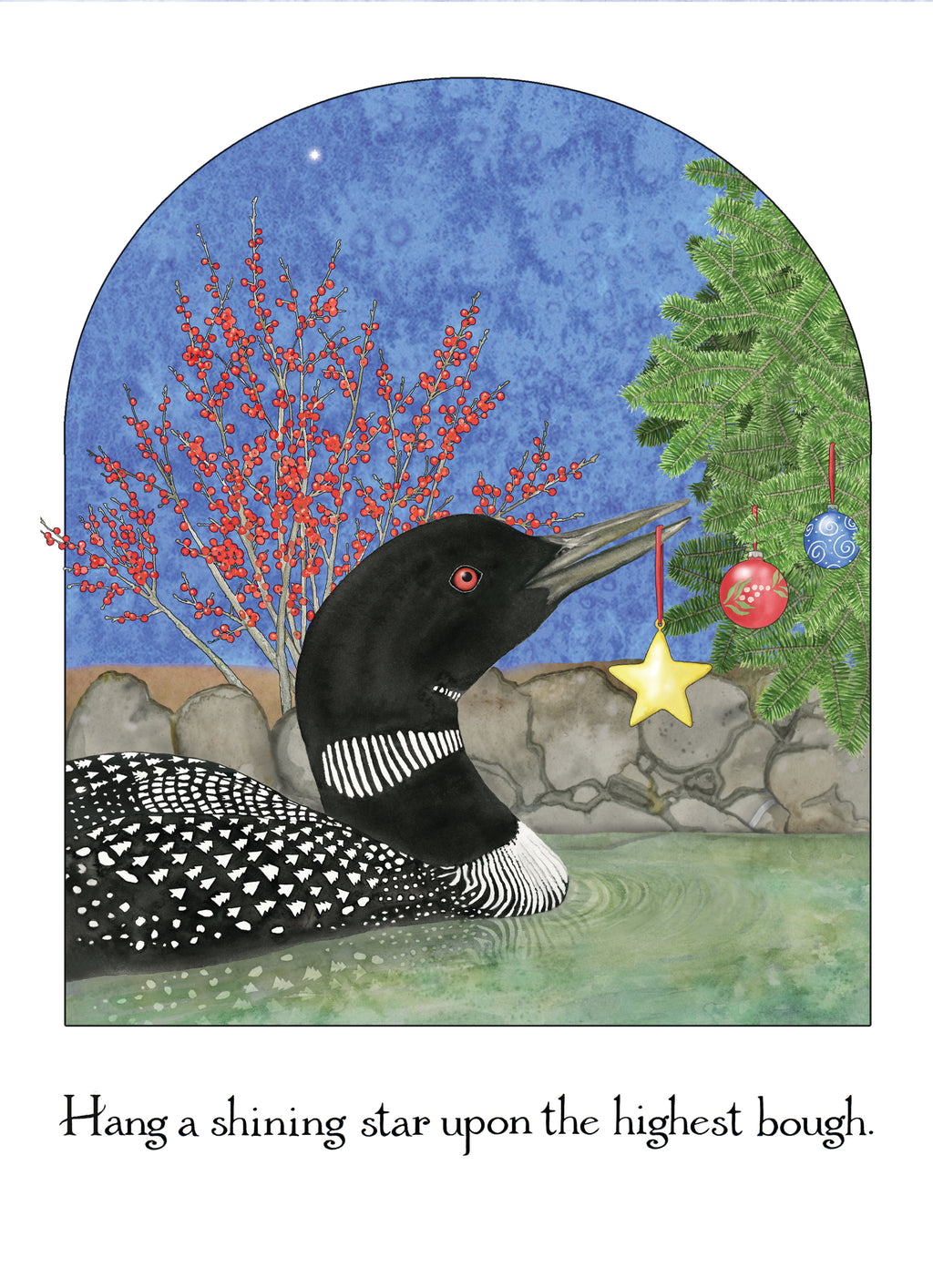 Decorate your soul with the quiet, peaceful beauty of our new holiday Loon card.Front Message: Hang a shining star upon the highest bow.